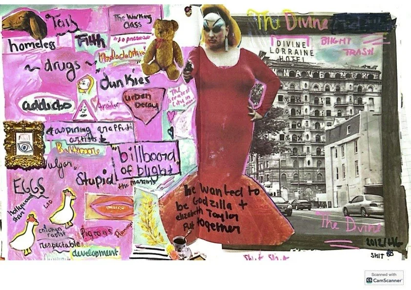 Inspiration: This collage juxtaposes Philadelphia's Divine Lorraine Hotel, with Divine, the star of John Waters Baltimore set camp classic Pink Flamingos. The Divine Lorraine is a storied building in North Philadelphia that for years sat abandoned before its "restoration" as high end apartment buildings and shopping. These apartments had high vacancy rates and by 2025 only the shopping leases remained, though the new owners plan to redevelop it into more new apartments. In the years between The Divine Lorraine's heyday and its redevelopment, it became a home for the unhoused, drug users, kids, grafitti artists and so called "urban explorers." Divine was a Baltimore based drag queen, known for his work with John Waters. In their first films, they used camp and gross out humor to highlight the absurdity of working class culture and homophobia. Pink Flamingos was initially panned and deemed pornographic by many, though it is now considered a cult and queer classic. The words throughout this collage are taken from contemporaneous reviews of Pink Flamingos as well as reporting on the Divine Lorraine in the decades when it was abandoned. This work seeks to address gentrification, classism, the racism inherit in both, and the art that was created and deemed as "just graffiti' or "porn" by residents of Baltimore and Philadelphia, two Mid-Atlantic cities that have more in common than a shared architecture. There is a culture of Mid-Atlantic cities and it is DIVINE