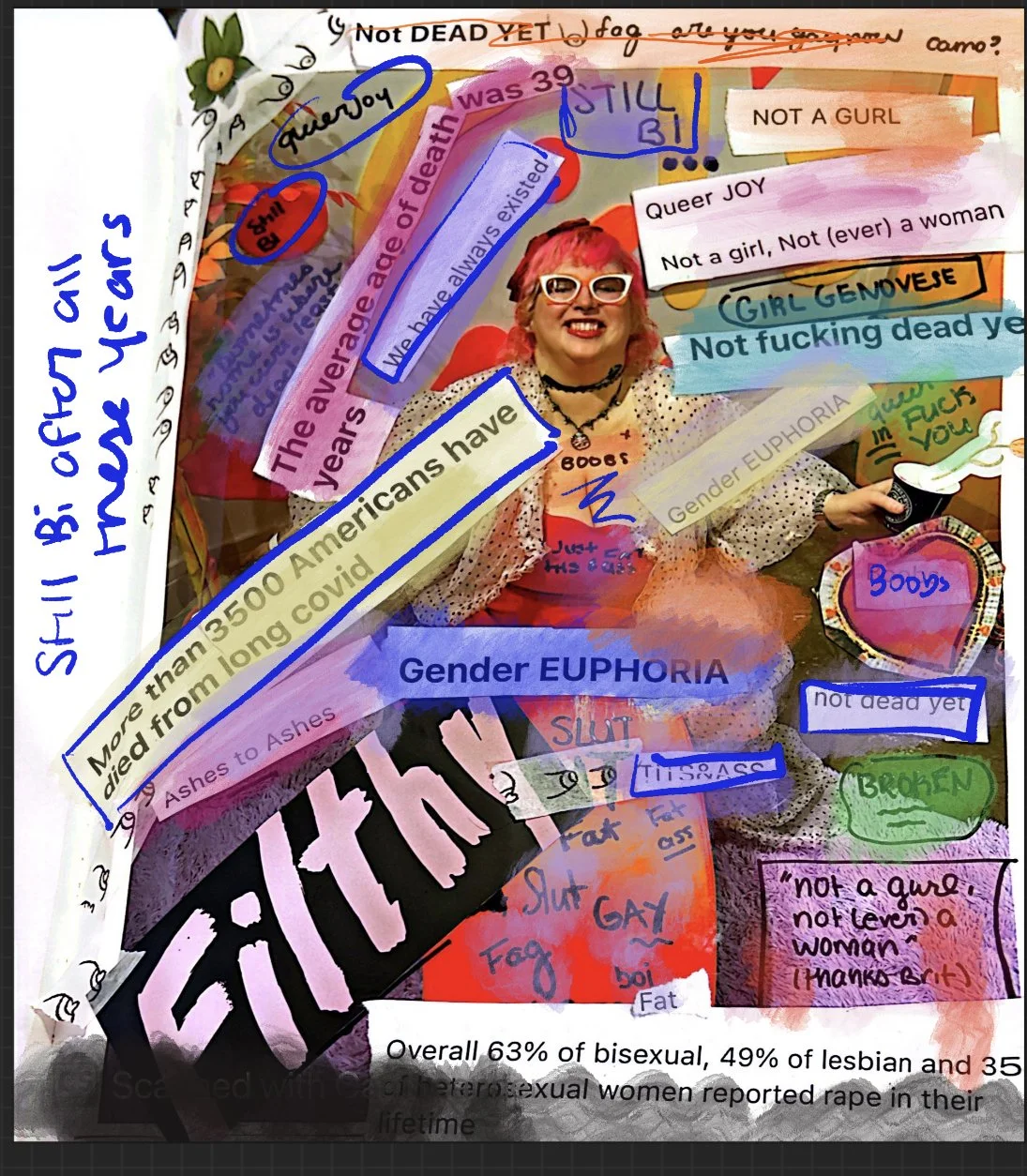 Mixed media, collage, photography, acrylic paint, paint pens, watercolors